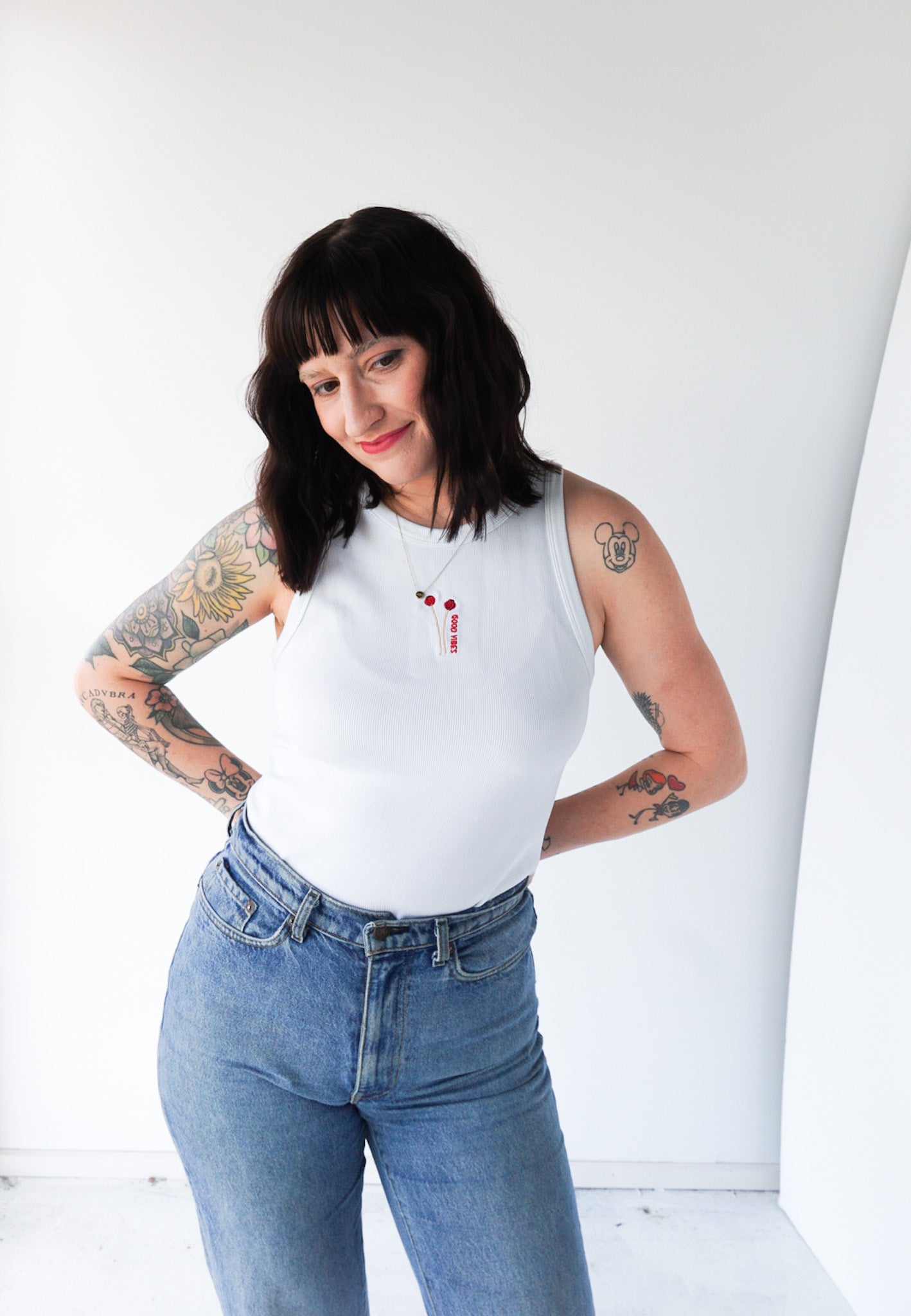 Model is also wearing the "Drummer Girl" denim button up. Not included with tank.