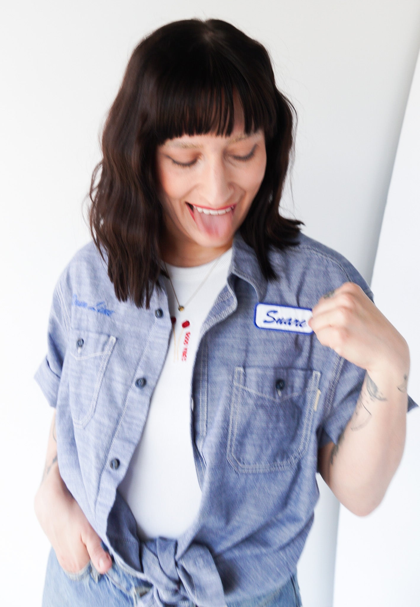 Model is also wearing the "Drummer Girl" denim button up. Not included with tank.